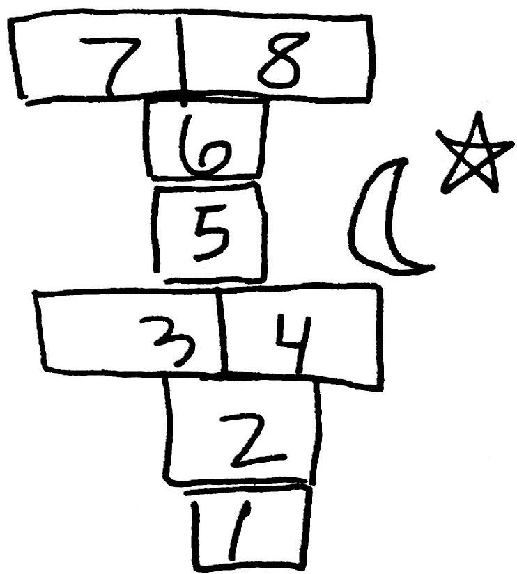 也许吧,也许他很清楚。星期五,学校开始放暑假的时候,他几乎已经开始相信这套说辞了。那天博比独自走路回家,萨利自愿留在学校帮忙把书搬到储藏室,卡萝尔则去蒂娜家参加庆生会。就在博比穿越艾许大道往步洛街走去时,他看到人行道上有人用紫色粉笔画了跳房子的格子,就像这样: